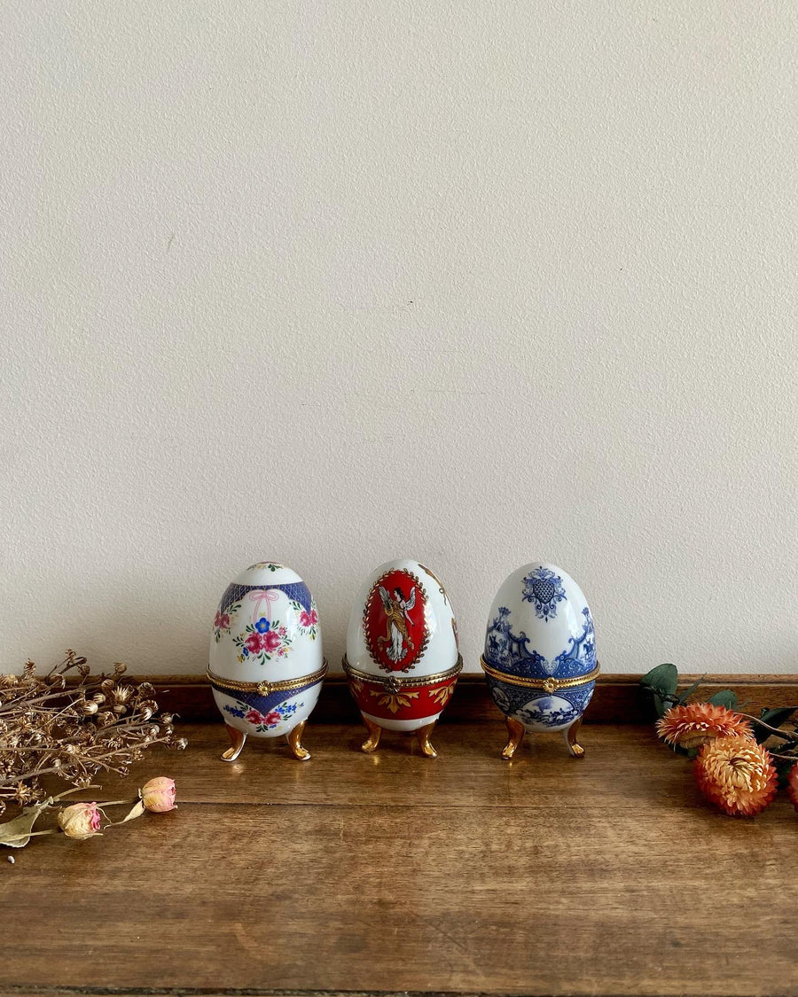 On ne les présente plus ! Voici trois nouveaux petits œufs décoratifs en porcelaine style Fabergé avec leur armature dorée. Peuvent être vendus séparément