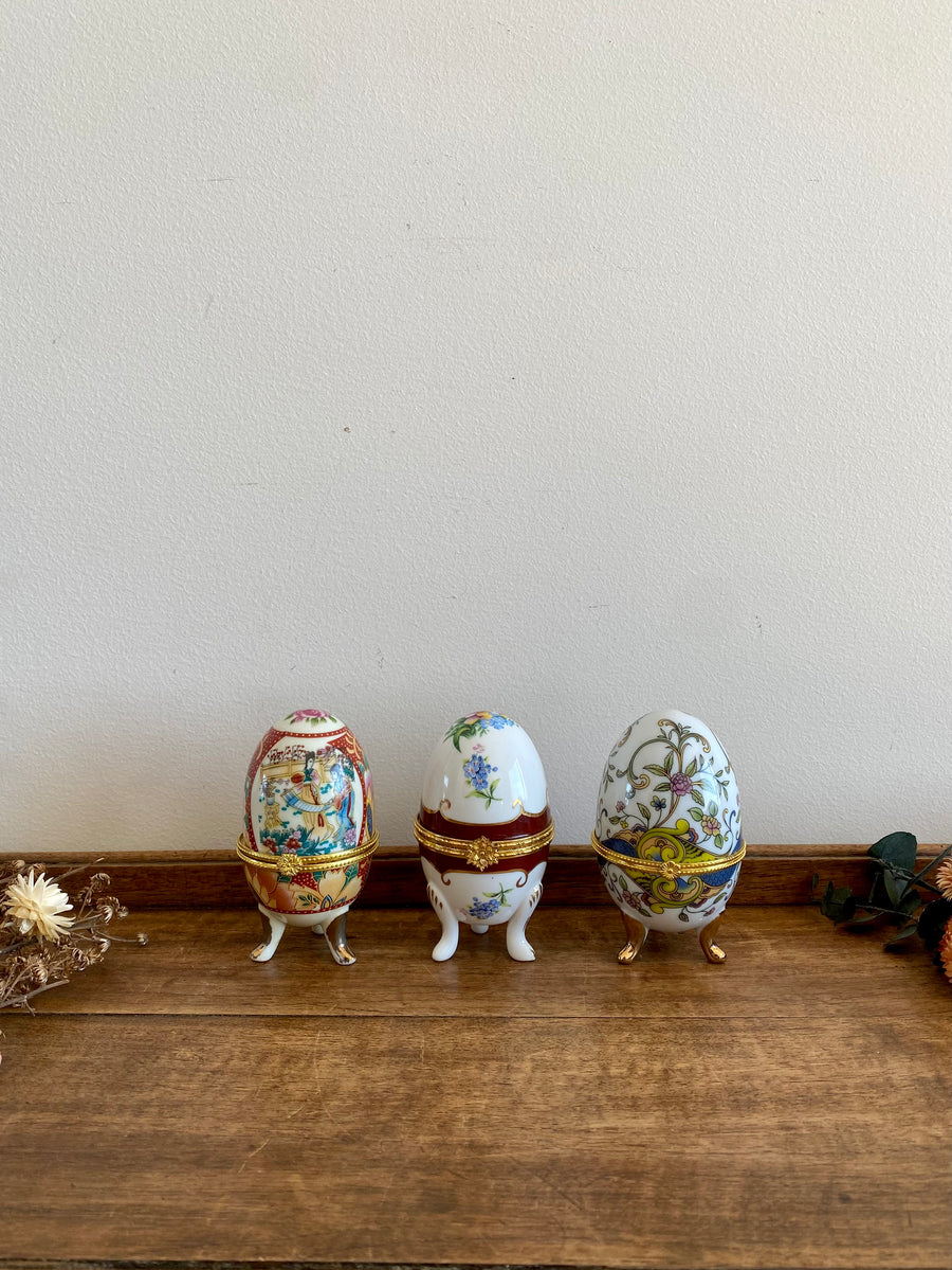 Jolis petits œufs sur pieds en porcelaine décorés, style Fabergé.