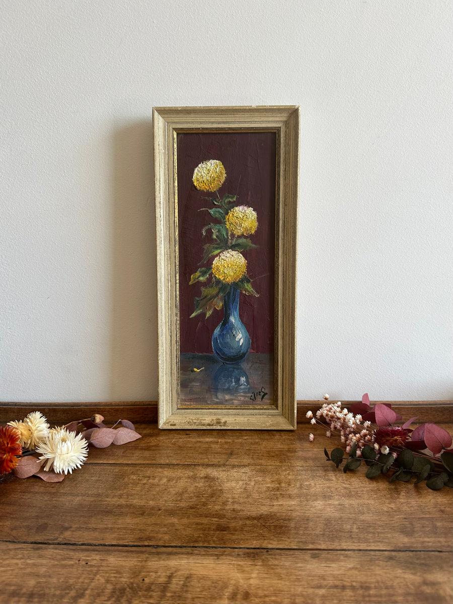 Ravissante petite peinture à l'huile représentant un joli bouquet de dahlias jaune pâle dans un vase. Estimation années 50