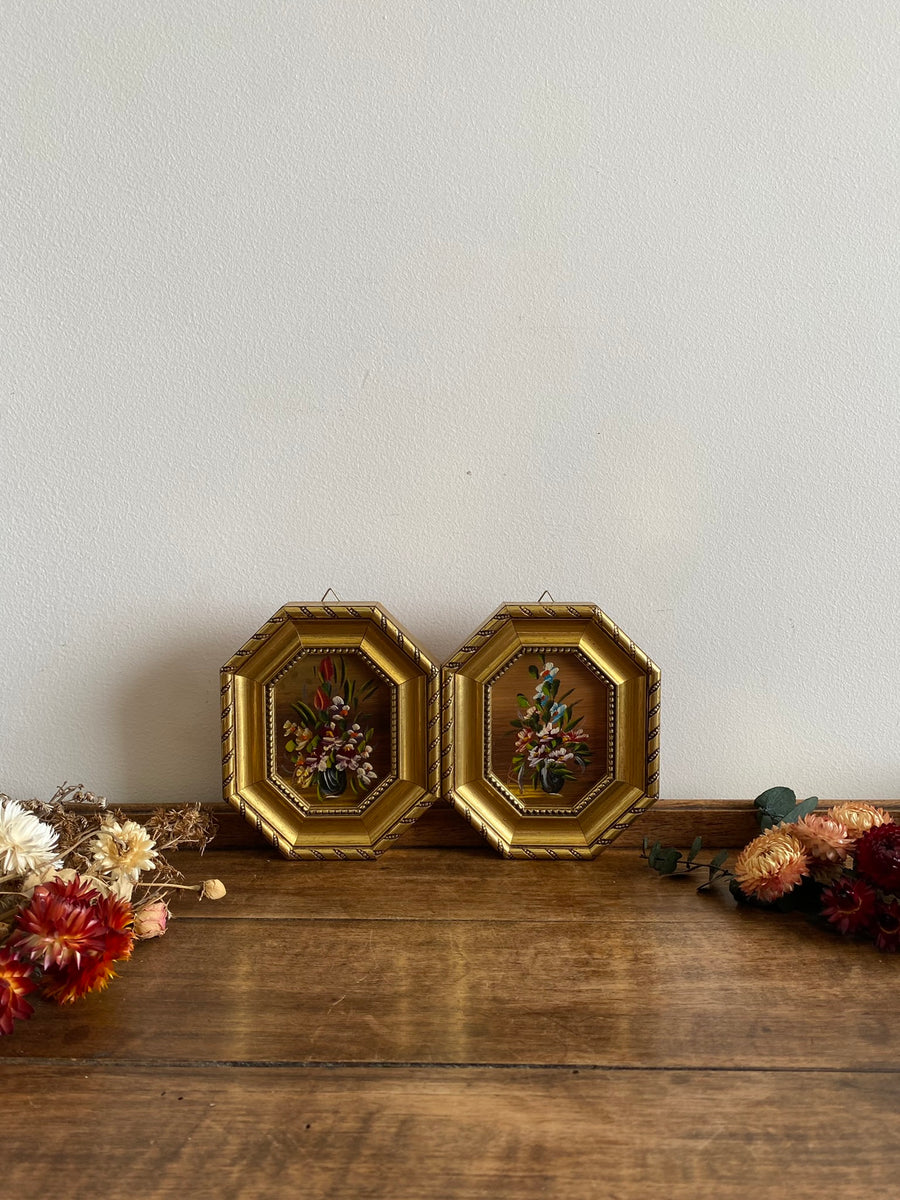 Duo de peintures représentant des bouquets de fleurs dans leurs cadres octogonaux en bois doré. Vendus séparément.