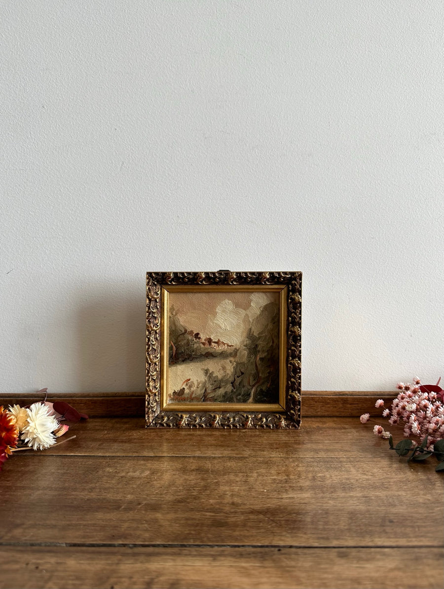 Adorable petite peinture sur toile représentant le bord d'une rivière dans son joli cadre en bois doré. Estimation année 50