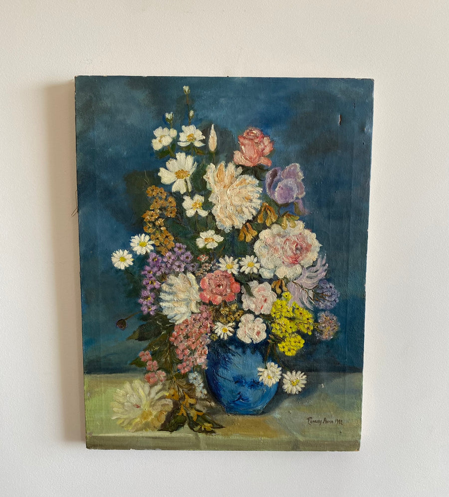 Peinture sur toile signée bouquet de fleurs tons bleus