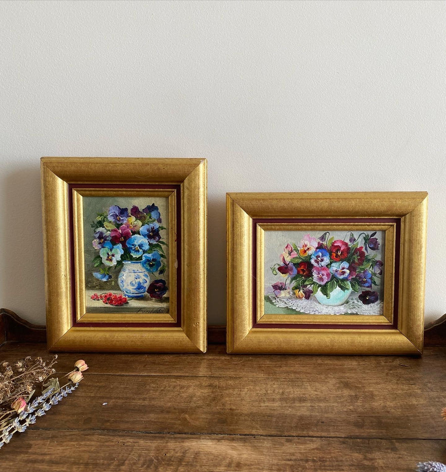Très belles peintures représentant des compositions florales signées Боровкова Л. dans leurs jolis cadres dorés épais et audacieux.