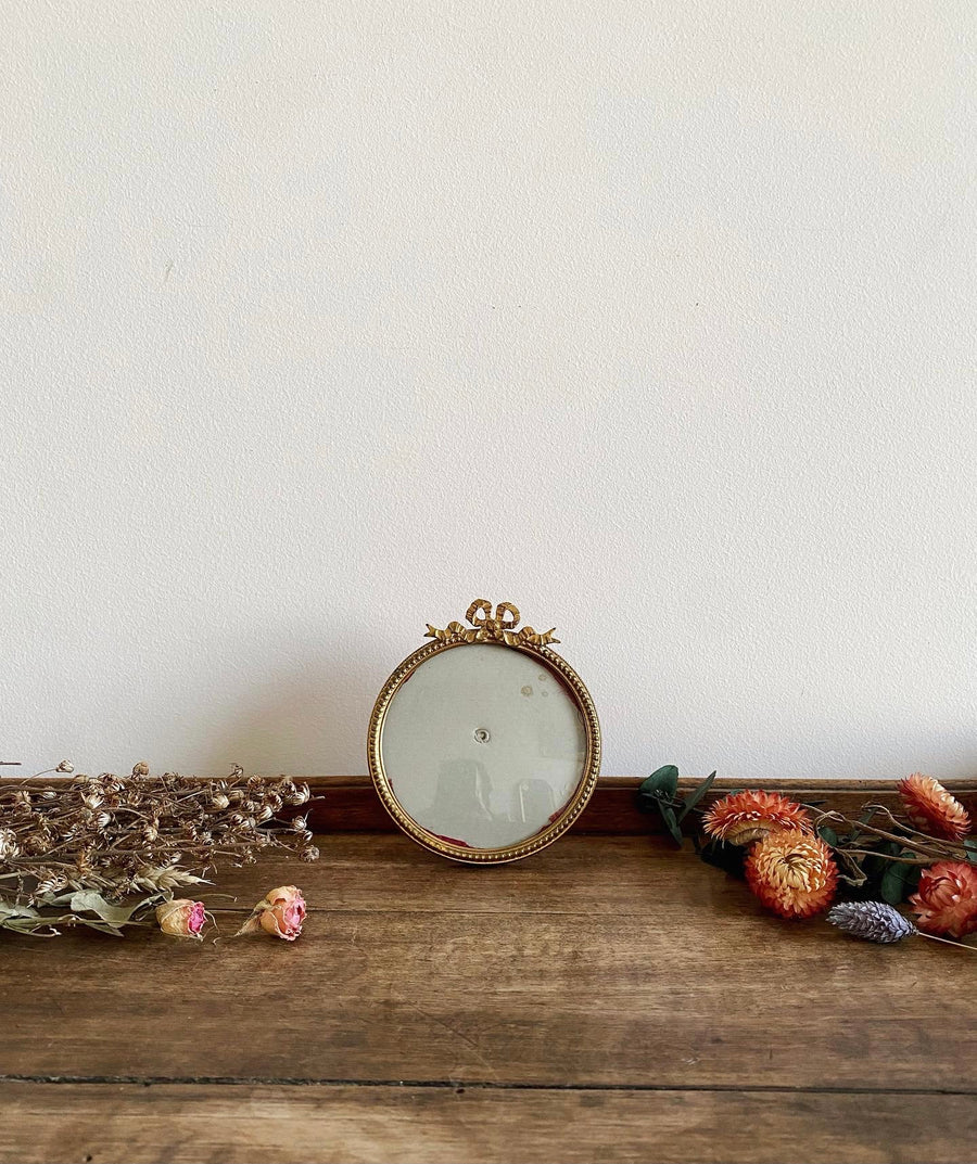 Adorable petit cadre en métal doré de forme arrondie surmonté d’un noeud rubané de style Louis XVI. Il possède un support à l’arrière vous permettant de le poser sur le meuble de votre choix.