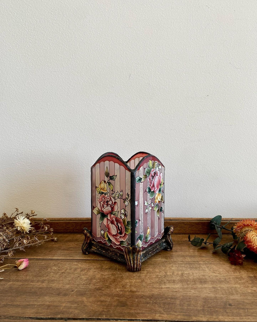 Joli petit photophore composé de panneaux décorés style art déco, ornés de roses sur son socle en métal.