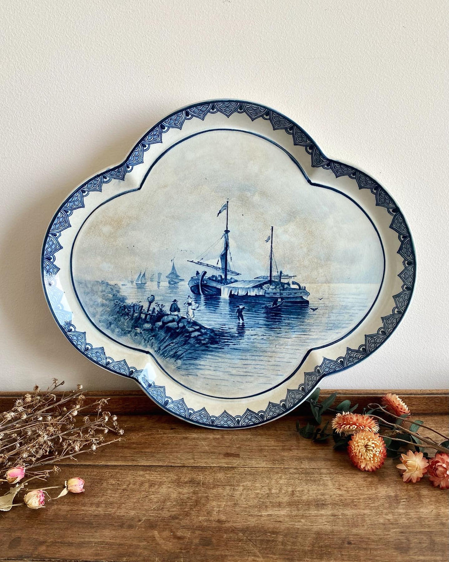 Ravissante plaque polylobée en faïence de Delft, fin XVIII, peinte dans un camaïeu de bleus, représentant un arrivage de bateaux; en très bon état pour son ancienneté.
