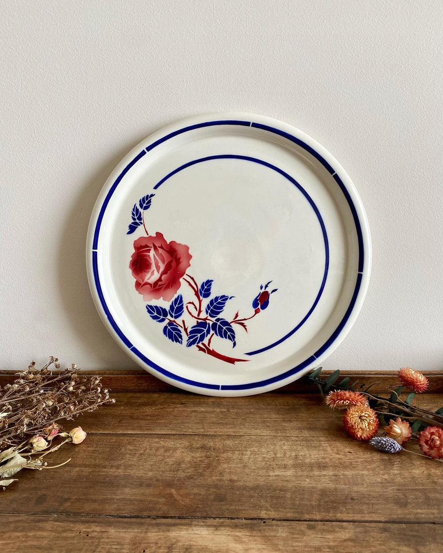 ▫Joli plat à tarte signé K&G Luneville France, collection CHANTAL, avec sa rose bleue et violette à l’élégance sobre.