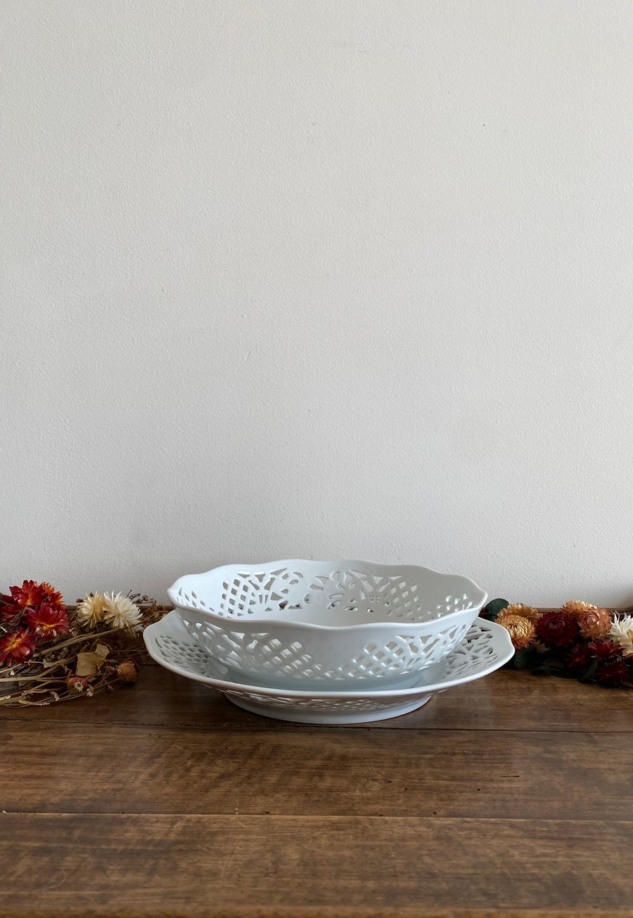 Charmant duo de plats de service ajourés. Composé d'une corbeille et d'un plat creux assorti en porcelaine blanche; Porcelaine de Limoges