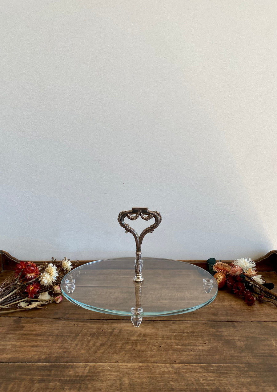 Élégant plateau en verre avec son manche en métal argenté et ses petits pieds travaillés.