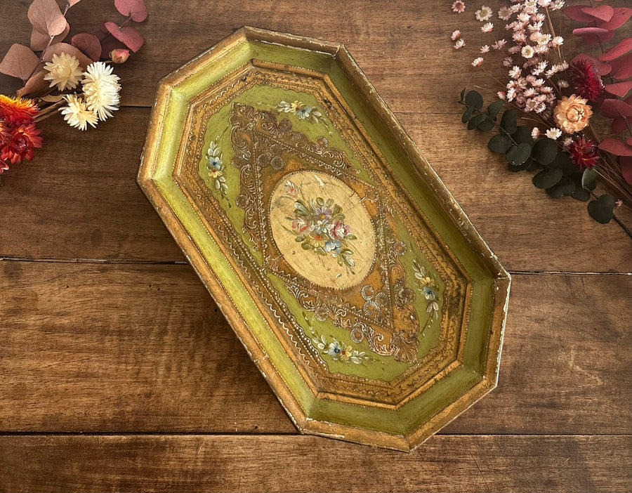 Plateau de service florentin en bois vert à rebords décoré main