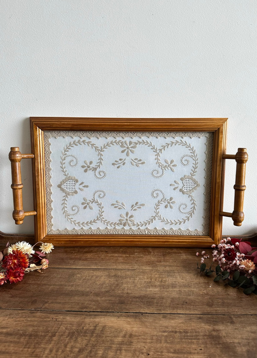 Ravissant plateau en bois avec anses. Doté d'une délicate broderie sous verre. Pour un petit déjeuner au lit tout en douceur !