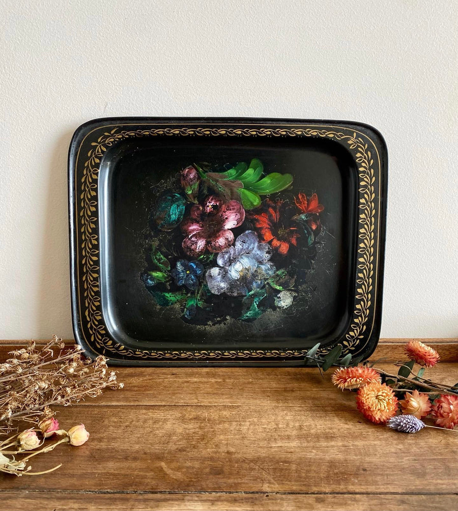 ▫Pièce rare ! Un ancien plateau en métal noir avec sa déco fleurie kitsch comme on les aime. Made in USSR. De claires traces du temps qui ne nous ont pas empêché de chavirer !