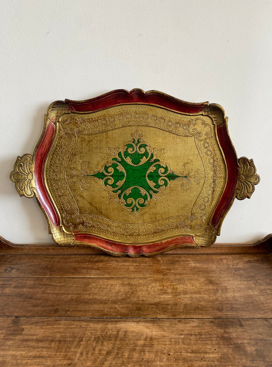 Beau plateau florentin aux tons vert or et rouge. A noter des imperfections à l"arrière.