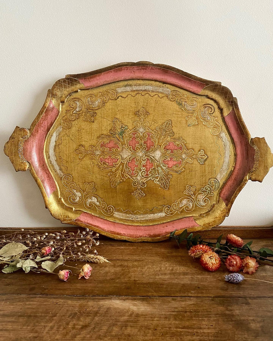 Plateau florentin en bois peint à la main avec ses délicates décorations aux teintes roses et or.