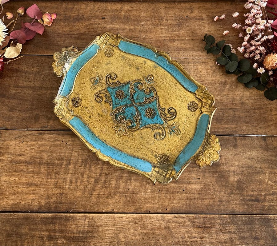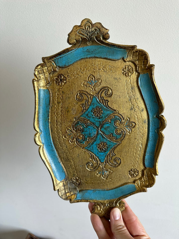Adorable plateau florentin en résine dans les tons bleus et or.