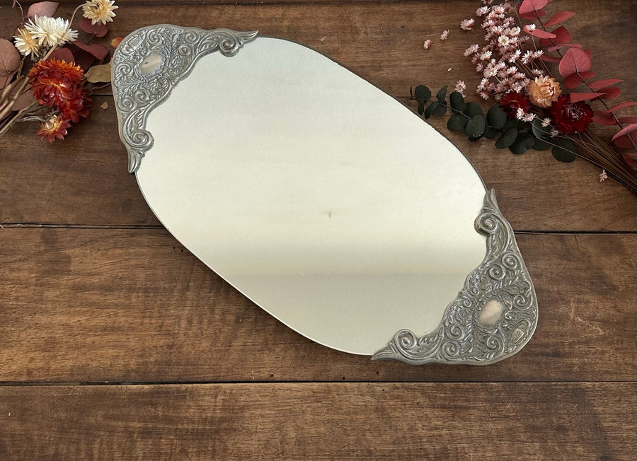 Elégant plateau miroir en métal argenté, doté de poignées travaillées. On adore son style art déco et ses 4 petits pieds.