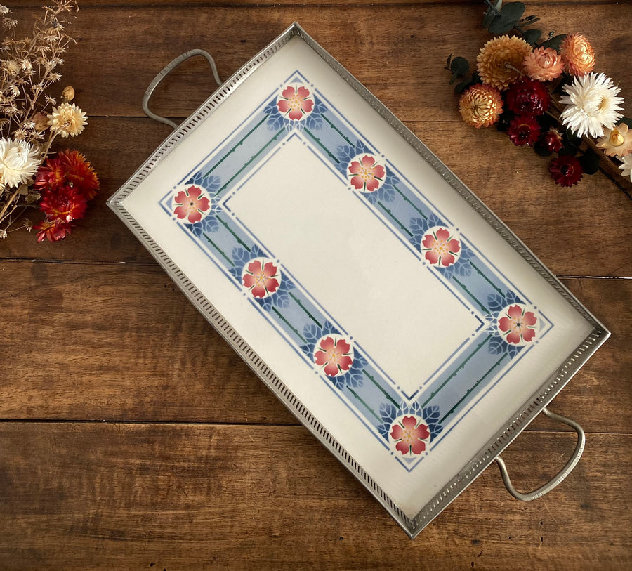 Adorable petit plateau en métal et porcelaine peinte. Estimation années 1920.