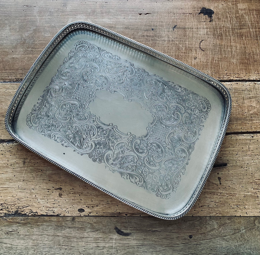 Charmant plateau de présentation en métal argenté avec ses jolis motifs de rinceaux ciselés et sa galerie ajourée. Estimation 1940.
