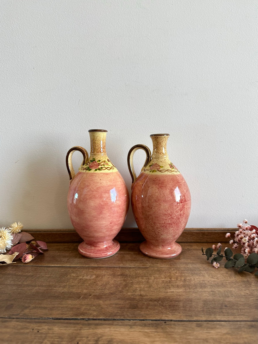 Pot à huile et à vinaigre en céramique vernis rose et jaune avec anse