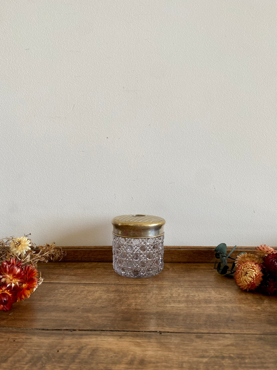 Elégant pot à brosse à dents en verre ciselé avec son couvercle en métal doré et argenté