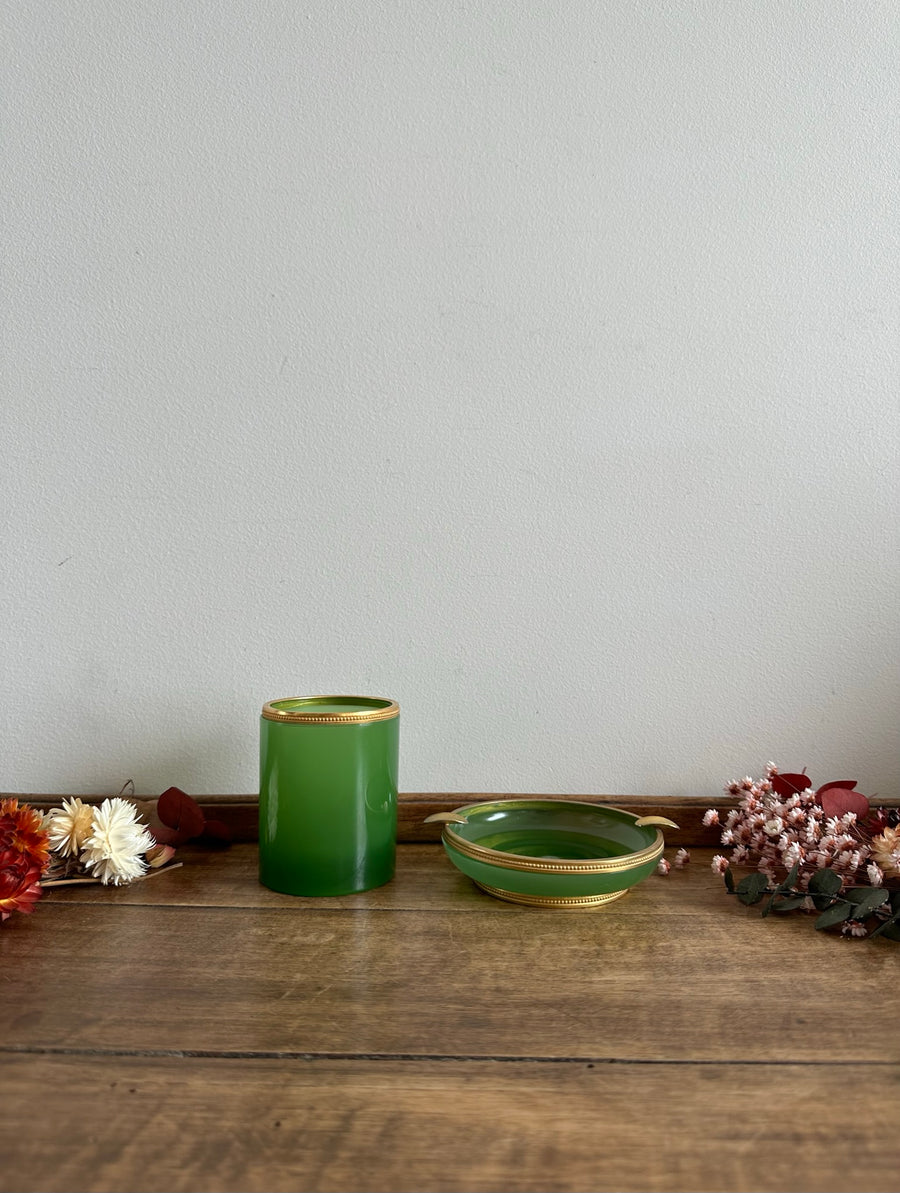 Pot et coupelle en verre opaline vert cerclés de métal doré