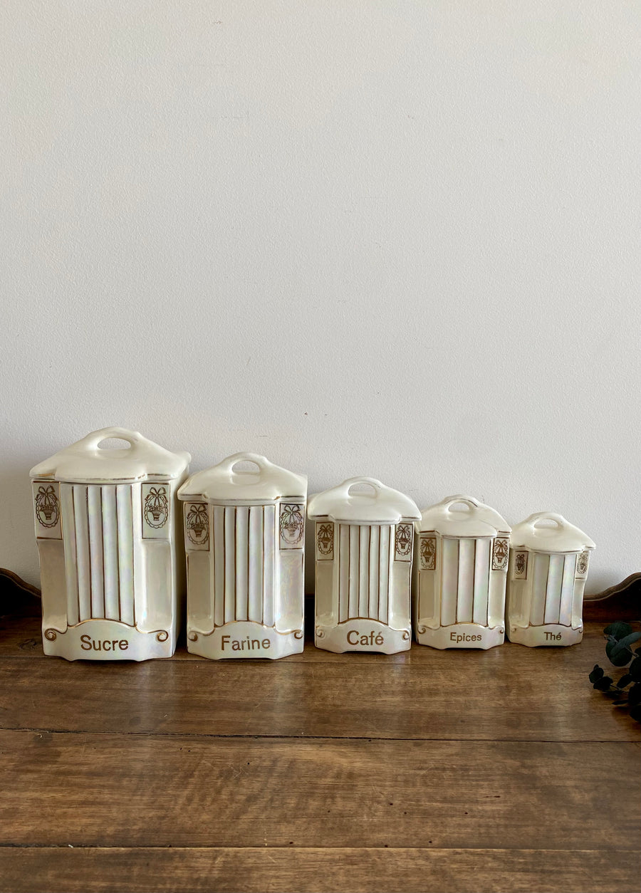 Charmant lot de 5 pots de cuisine art déco très anciens, en porcelaine émaillée: sucre, farine, café, épices, thé.