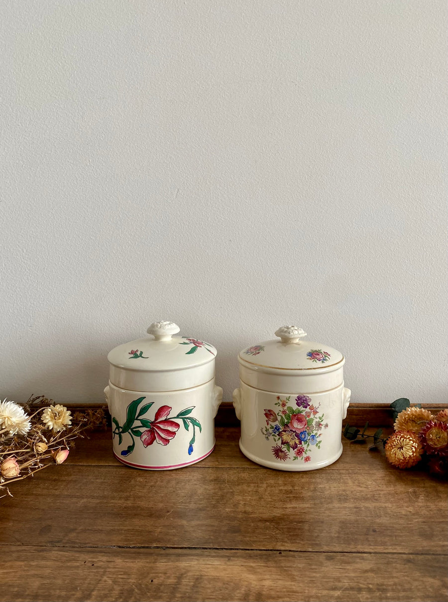 Lot de deux jolis petits pot signés Sarreguemines. On aime leurs jolies fleurs colorées. De légères traces du temps sont à noter et visibles sur les photos. Estimation années 50. Vendus séparément.