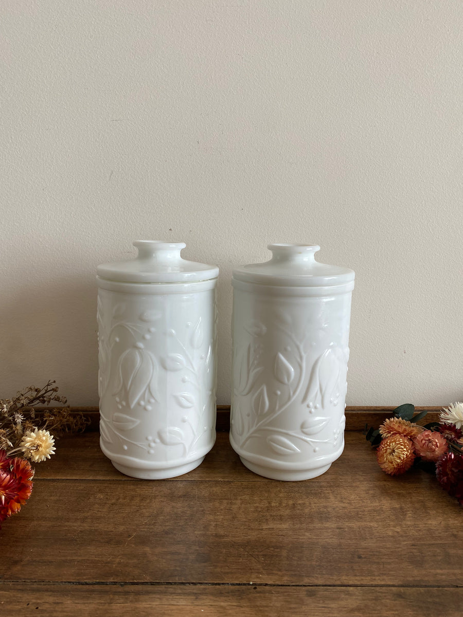 Pots en opaline blanche motifs fleurs en relief