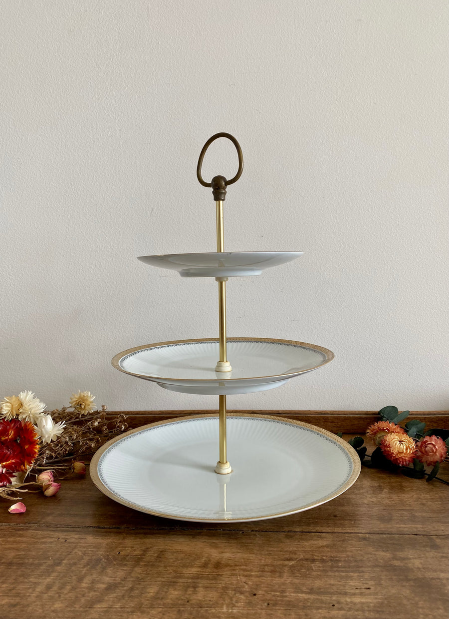 Élégant présentoir composé de trois assiettes en porcelaine de Bavaria dotées d'un joli liseré doré