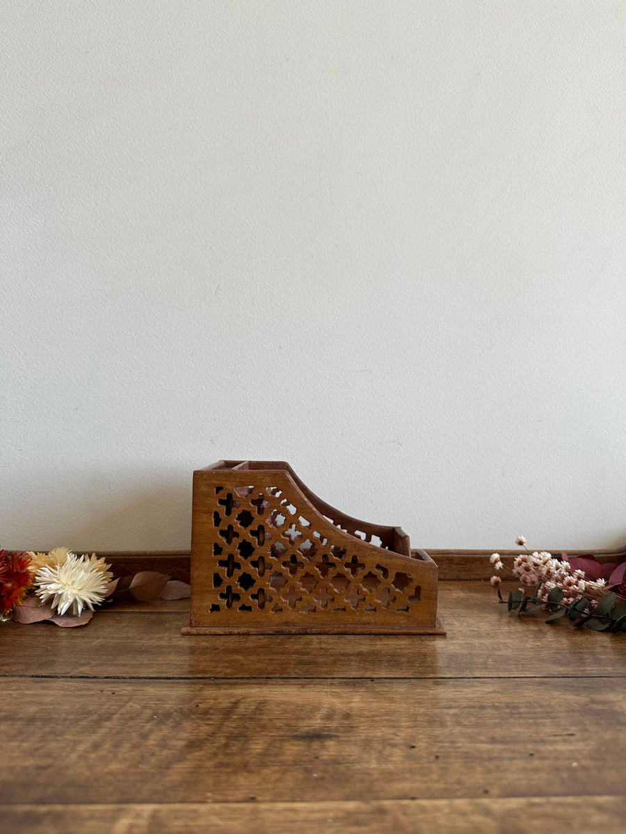 Ravissant petite boite à crayons et papiers en bois faite main. On aime ses côtés ajourés travaillés et sa jolie patine. Objet dans son jus. Estimation années 60.