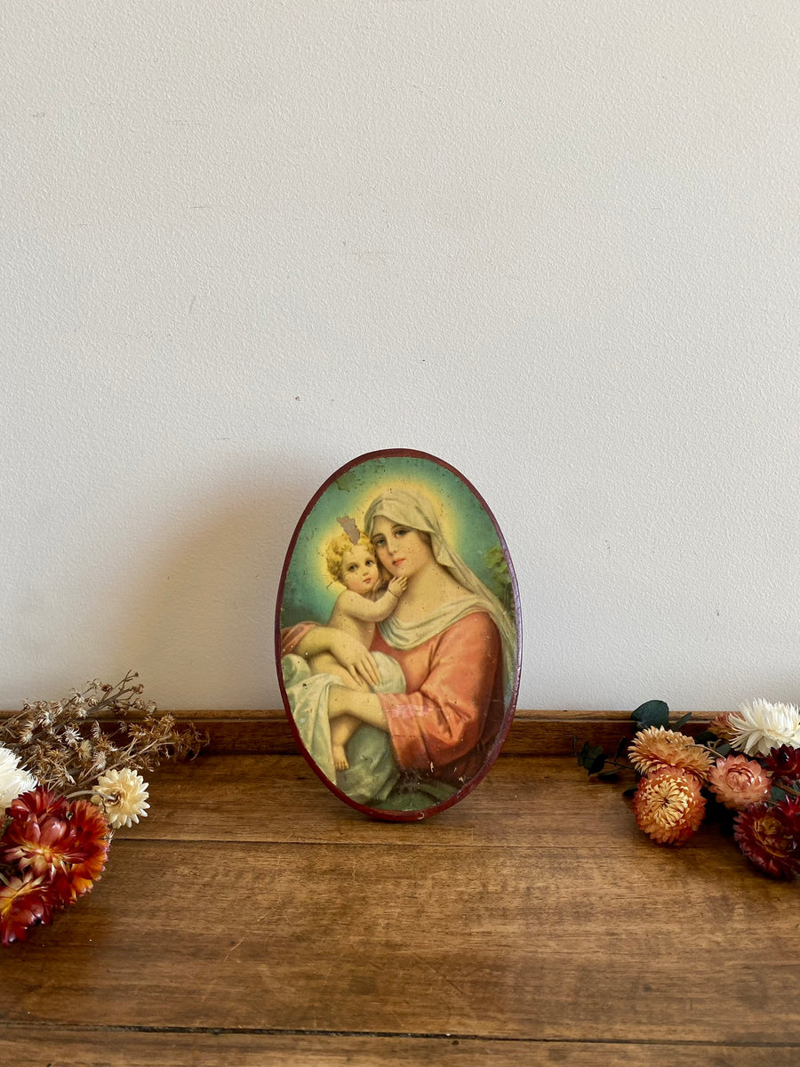 Belle représentation religieuse de La Vierge et l'Enfant icône sur bois. Estimation années 50-60.