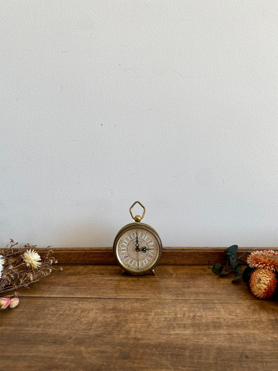 Adorable petit réveil matin Famous vintage en dentelle de laiton doré.