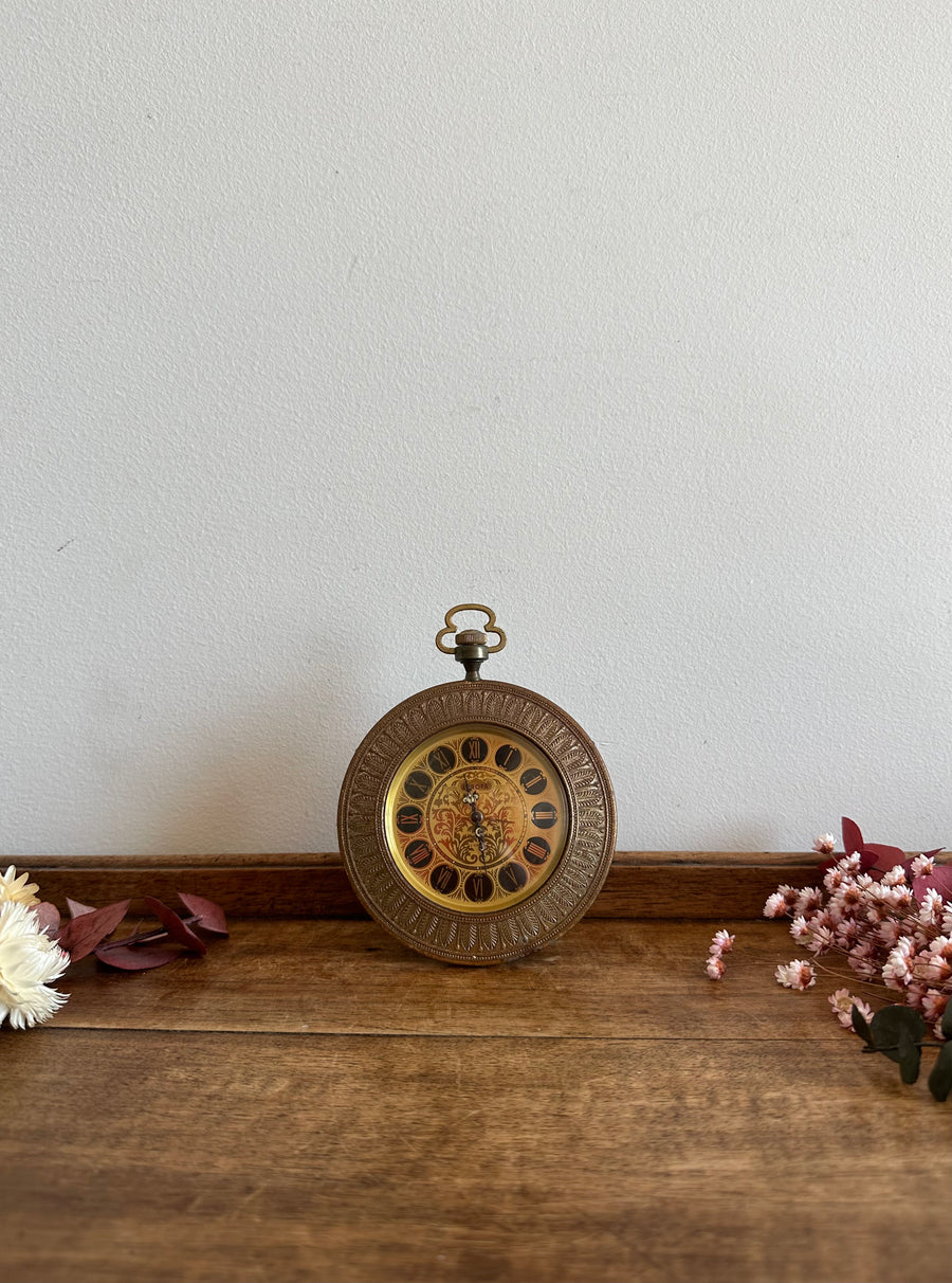 Ravissant réveil matin à poser en métal doré Europa. On aime ses jolis détails gravés et sa numération romaine or réhaussée sur fond noir. De petites traces du temps visibles sur les photos sont à noter. Ne fonctionne pas mais pourrait être remis en état par un expert.