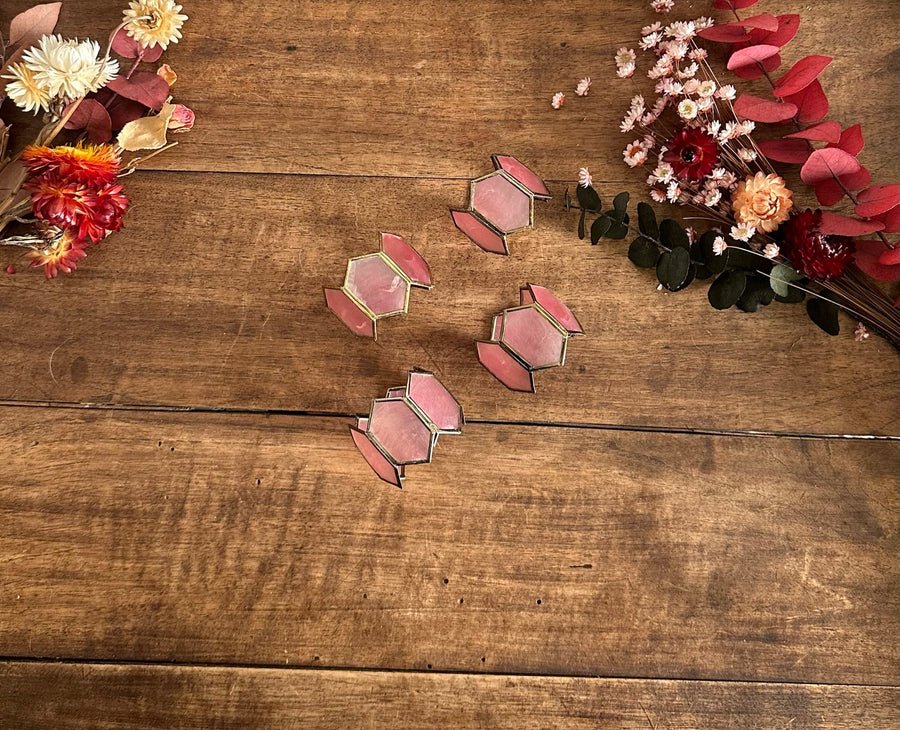Coup de coeur pour ces 4 jolis ronds de serviette de forme hexagonale en nacre rose. Vendus ensemble