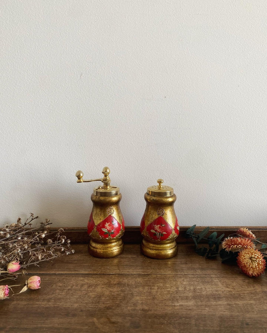 Duo de salière et moulin à poivre rouge et mordoré en bois style florentin par Renzo Carli