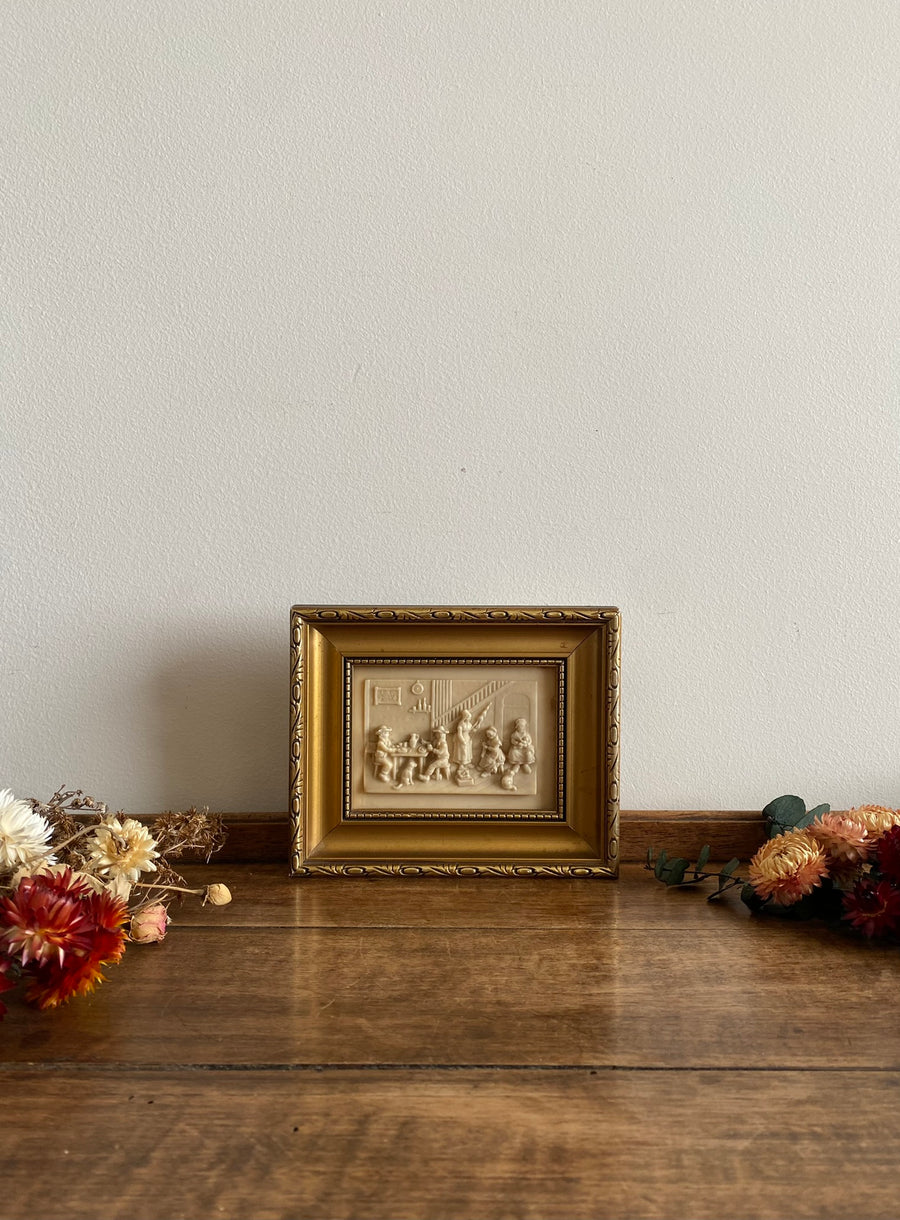 Sculpture sur pierre calcaire scène de villageois cadre doré