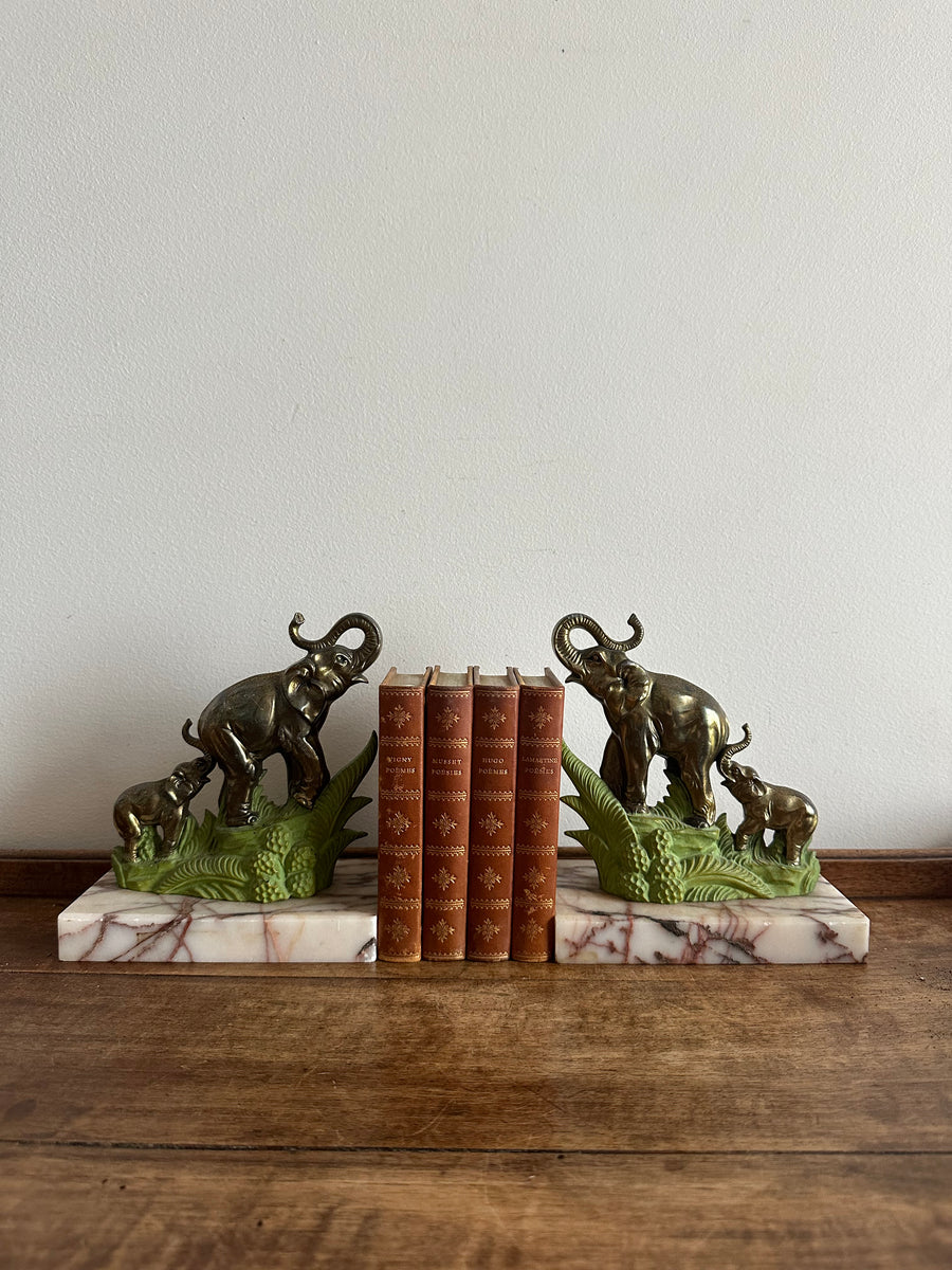 Coup de coeur pour cette paire de serre-livres éléphants Art Déco. Socle en marbre. Eléphants en alliage de zinc patiné or et vert. Serre-livres zoomorphes. Eléments idéals pour une déco pleine de caractère ! De jolies traces du temps et petites imperfections attendues pour leur âge. Vendus séparément