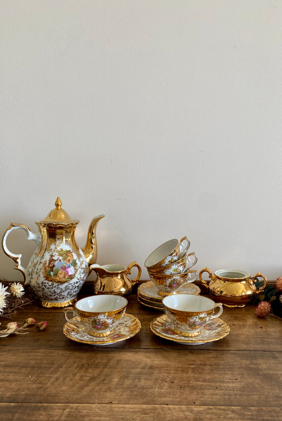 Joli petit service à café vintage aux scènes d'époque romantiques, en porcelaine de Bavaria, made in Germany