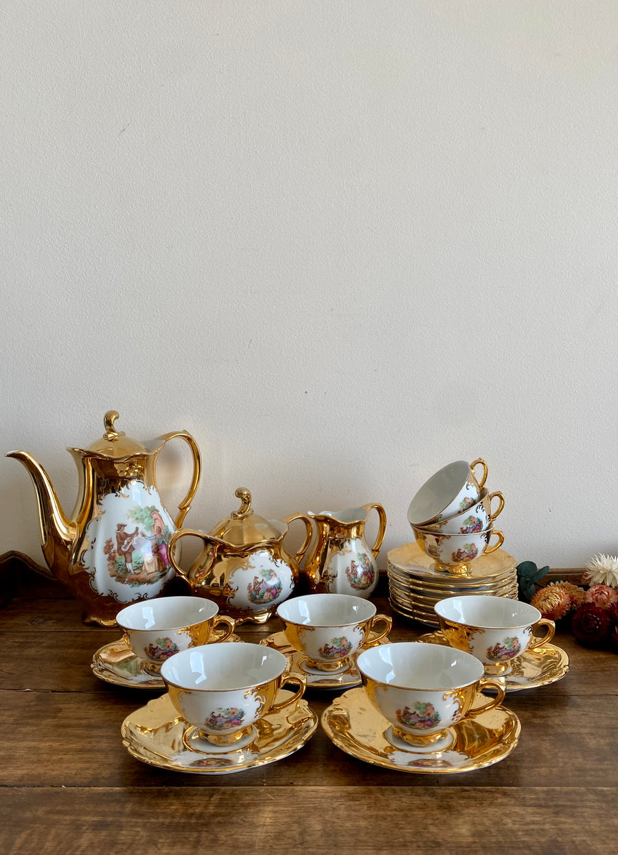 Joli service à café en porcelaine Bavaria modèle Tirschen doré scènes romantiques. Composé de 12 petites tasses et leurs soucoupes, un pot à lait, une cafetière, et un pot à sucre. De légères traces du temps sont à noter sur les dorures.