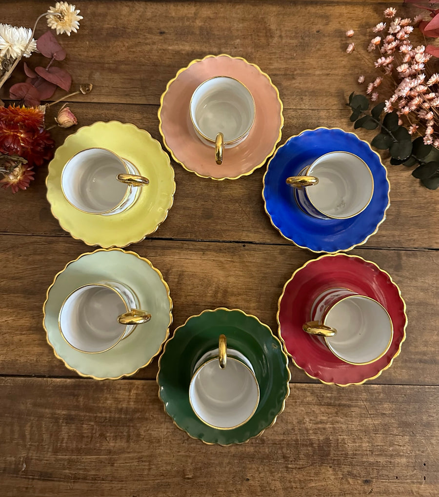 Ravissant petit service à café en porcelaine colorée. On adore ses jolies frises fleuries et ses détails dorés. Composé de 6 tasses et soucoupes assorties. Vendu ensemble