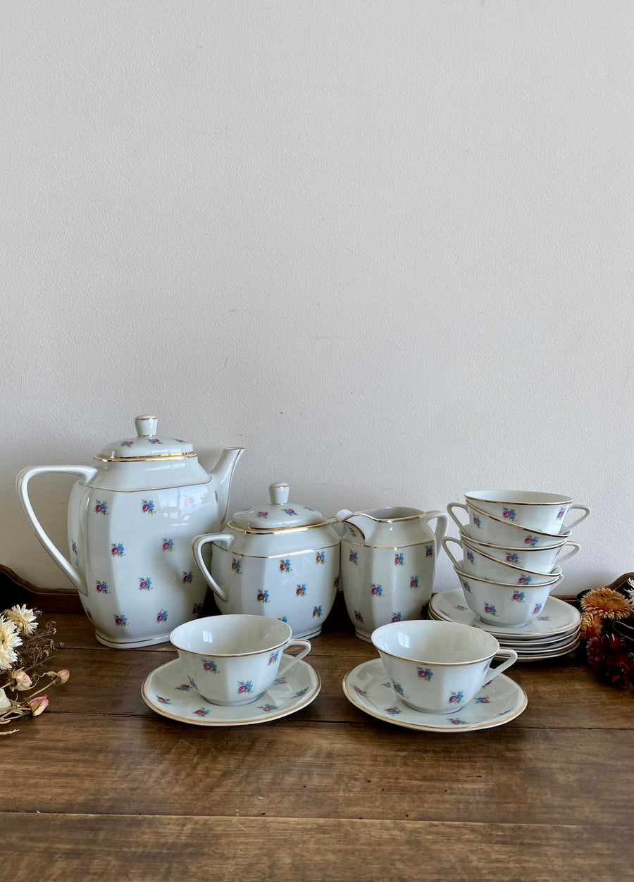 Composé d'une cafetière, d'un pot à sucre, d'un pot à lait, et de 7 tasses et sous tasses assorties.