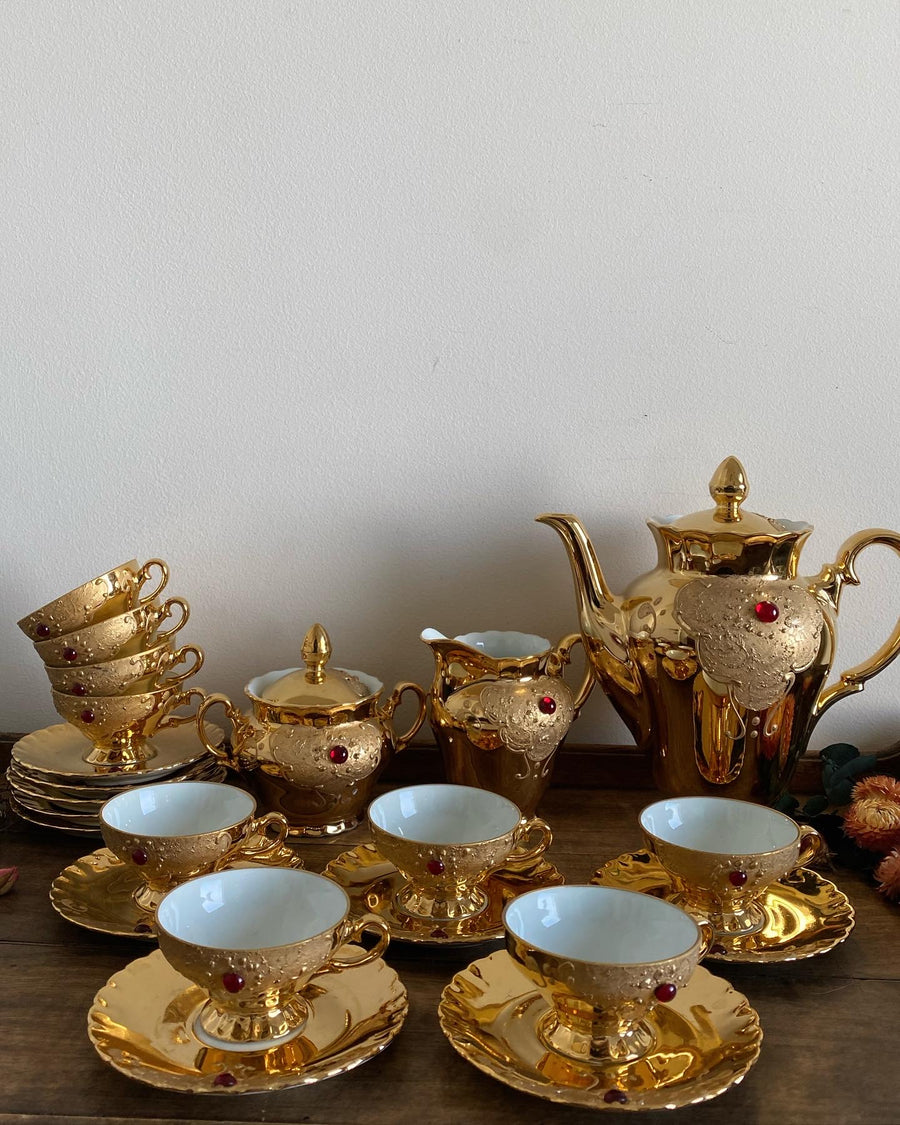 Voici un magnifique service à café complet doré, chaque pièce est sertie d'une petite pierre rouge fantaisie.