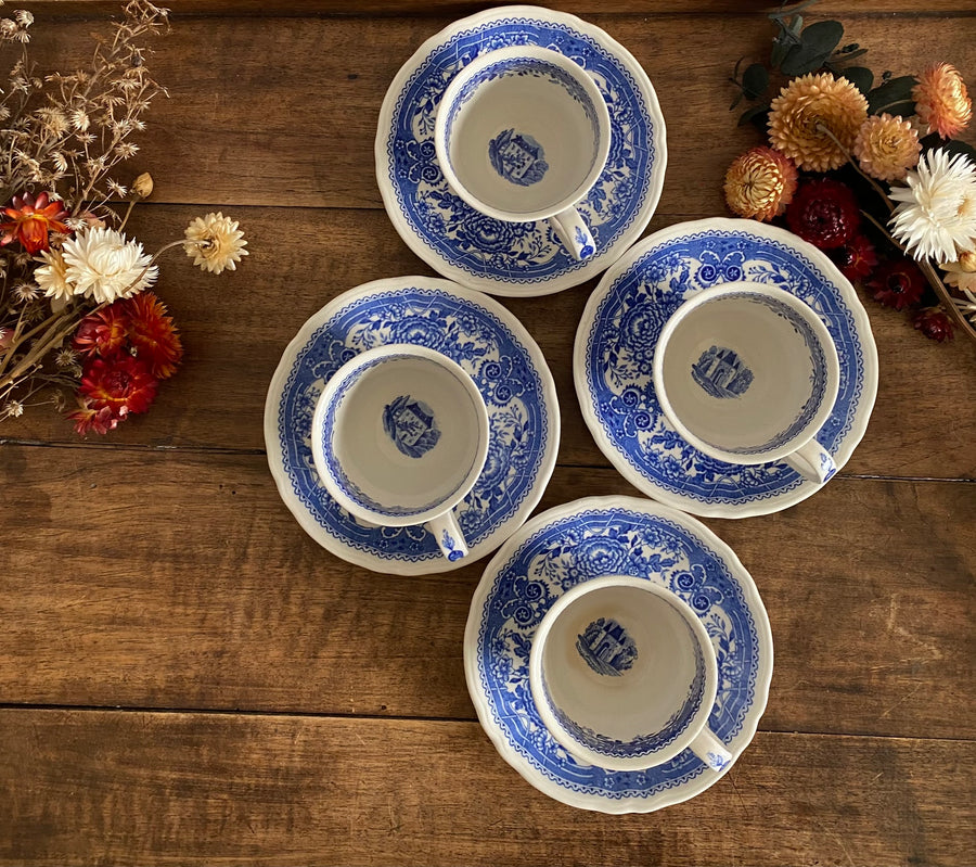 Adorable service à café Villeroy & Boch, fabrication Allemande composé de 4 tasses et soucoupes assorties. On adore les petits motifs à l'intérieur de chaque tasse ! Vendu ensemble