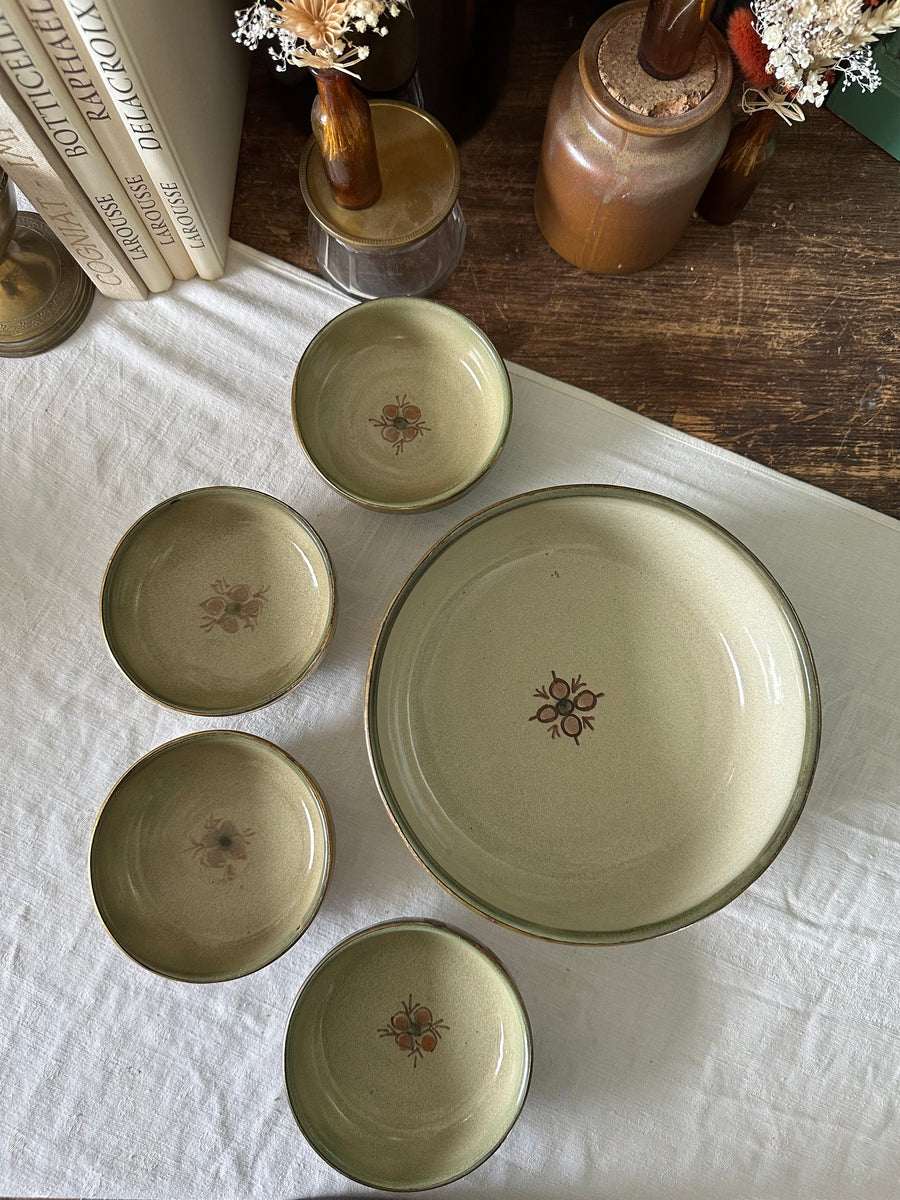 Charmant service à dessert en céramique émaillée, cerclée de laiton. Décoration à la main. Estimation années 60. Origine italienne.Vendu ensemble