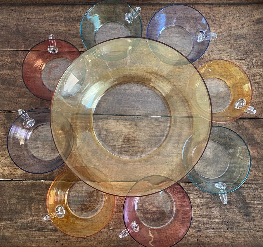 Ravissant service à dessert coloré en verre légèrement irisé.