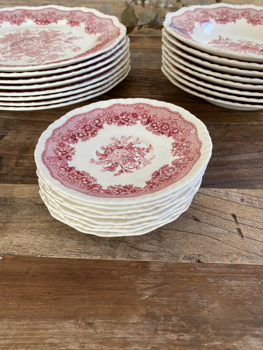 Ravissant service complet composé de 8 assiettes plates, 8 assiettes creuses et 8 petites assiettes. Fabrication anglaise. Mason's Patent Ironstone. Modele Ascot England. A noter deux des petites assiettes comportent des démarcations au centre que les autres n'ont pas. Vendu ensemble.