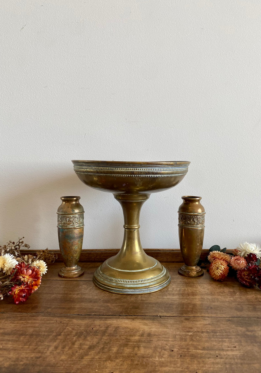 Bel ensemble composé d'une coupelle en métal et cuivre et de deux petits soliflores assortis.