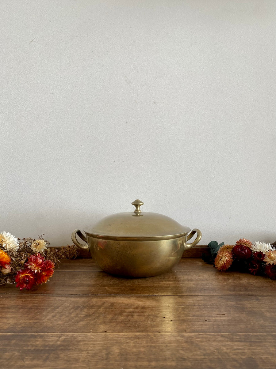 Élégante soupière en métal doré et argenté dotée d'un joli couvercle et de deux anses. Sera parfaite en déco sur un buffet ou dans une cuisine !