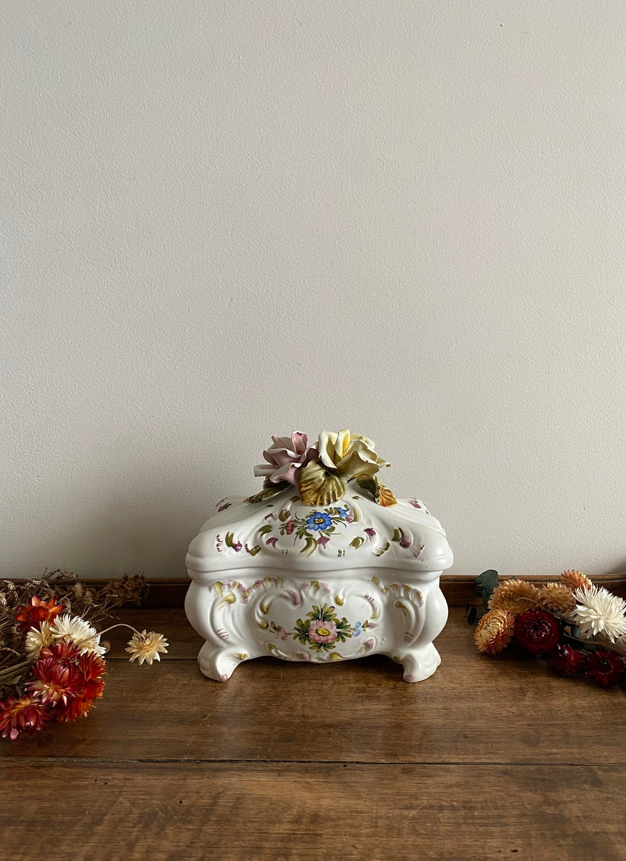 Soupière rectangulaire sur pieds ornée de fleurs sculptées