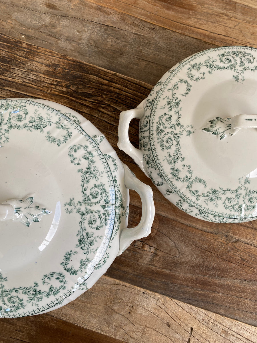 Deux ravissantes soupières anciennes, en porcelaine opaque de GIEN, terre de fer, modèle Miramar.
